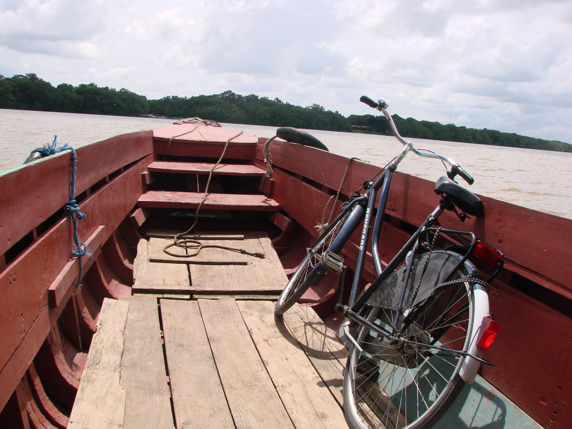 Eenmaal de stad uit werd het een stuk aangenamer. Prima keus dat fietsen en inderdaad, gewoon rechtdoor en na zo’n 10 km was er een pontje. Niet dat dat aangegeven was maar 2 restaurantjes bij elkaar en wat geparkeerde auto’s betekend meestal dat er iets bijzonders moet zijn. En ja, een lange smalle steiger met 3 bootjes aan het einde: hup, fiets erin, ik erin, nog een jongen met z’n vogelkooitje en voor 5 euro waren we aan de overkant. Natuurlijk veel te veel betaald, maar goed, men begon bij 10 euro en bovendien stapelden de donkere wolken zich op aan de overkant. Inmiddels had ik al wel wat ervaring met de plensbuien en ik wilde ze vandaag graag vermijden.
