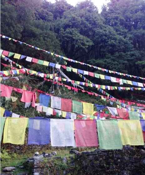 Maar de échte momenten waren de waanzinnige uitzichten op de witte bergtoppen en ketens en de, zo lijkt het, haast ongerepte bergdorpjes met overal de Tibetaanse gebedsvlaggen en prachtige mensen. Hier niks geen kindjes die om pennen of bonbons vragen, hier vouwen ze hun handjes, zeggen Namaste en geven je vervolgens een al dan niet voorzichtige maar altijd welkome lach. Hetzelfde geldt voor de ouderen. Ze groeten je met Namaste en een lach, bekijken je even en gaan vervolgens door met wat ze waarschijnlijk al jaren doen: wassen, stenen hakken, geiten uitlaten, koken, melk of water halen, op het veld werken, rijst drogen of wat dan ook. Dat is het leven in de dorpjes die we passeerden of waar we overnachtten.