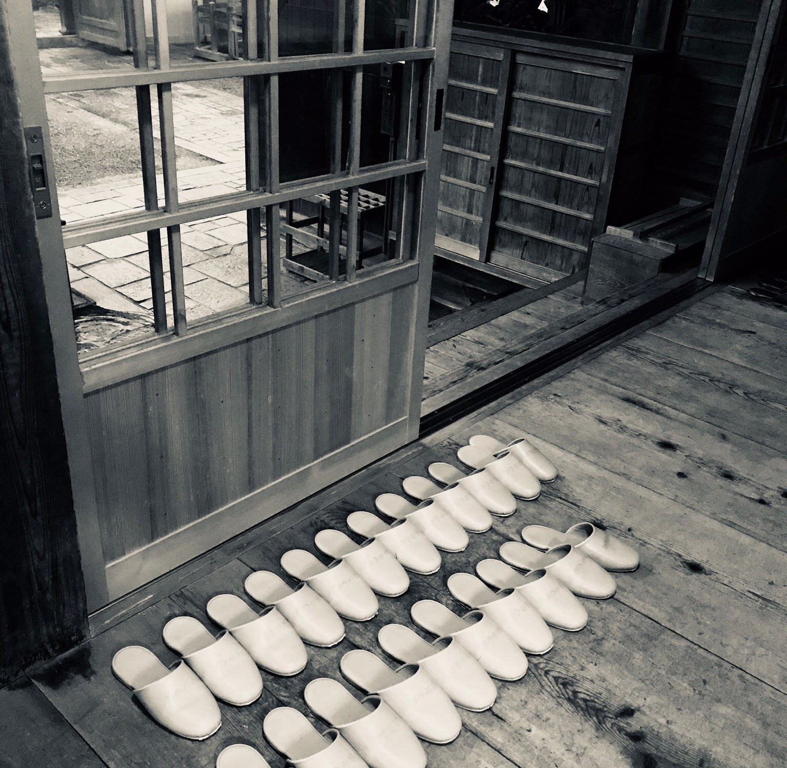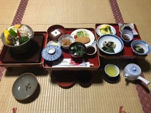 Maar terug naar het regime en de structuur. Ze komen pas opruimen als je de schuifdeur weer open doet en je pantoffels dus niet meer voor de deur staan. Eerste avond voelde wat ongemakkelijk, ik was klaar met eten, maar dan? Moet je wachten, moet je weggaan? Uiteindelijk maar voor het laatste gekozen en dat bleek dus de juiste keuze te zijn anders had ik er nu nog gezeten. En dat zitten op zo’n plat kussen wordt toch echt ongemakkelijk op den duur. Alle ruimtes lijken op ingenieuze wijze met elkaar verbonden door de fusuma (schuifdeuren) en kunnen dus eenvoudiger groter of kleiner worden gemaakt, heel efficiënt. Verder lange houten krakende gangen met af en toe een mooi stukje tuin.