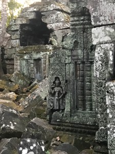We vinden al snel online de top 3 mooie, maar minst bezochte tempels. Nou zou je kunnen zeggen dat zodra dit online staat de waarheid al achterhaald is, maar feit was dat Suna bij twee van de drie nog nooit geweest is. Natuurlijk nemen we en passant de bekendere exemplaren mee, maar dan tegenovergesteld aan de ‘volg de zon route’. Tegen sluitingstijd lijkt de beste om de horde toeristen te vermijden. Ta Nei, te bereiken via een afgelegen zandweg, hebben we helemaal voor onszelf, minstens net zo mystiek als Ta Prohm. Kleiner, maar ook nog onderdeel van het oerwoud met tentakel achtige wortels en takken die de tempel lijken te willen vermorzelen. Mooie tekeningen van de boeddhistische mythologie, maar het is het geheel wat zo aangrijpt. Doodstil, alleen het geluid van duizend krekels. A ‘ruined ruin’, mooi!