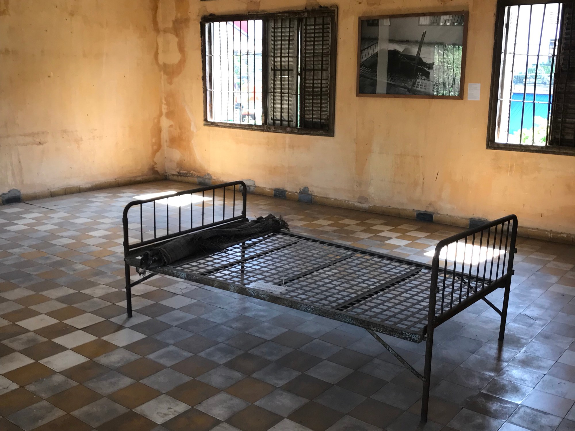 De audio gids op locatie was een van de beste die we ooit gehad hebben. Perfect verstaanbaar en het bracht deze gruwelijke werkelijkheid nogal dichtbij. In de voormalige schoollokalen, soms nog met een schoolbord aan de muur, staan de ijzeren bedden met stangen voor enkelboeien. De bloedvlekken op de grond als stille getuigen van de gruwelen die zich daar hebben afgespeeld. Op de binnenplaats een klimrek, door de Rode Khmer gebruikt om gevangenen aan hun voeten op te hangen en in grote waterkruiken weer bij te brengen zodat de foltering voortgezet kon worden. Veel foto’s van de onschuldige gevangenen en verhalen van Cambodjanen die de tocht naar het platteland hadden meegemaakt en als dwangarbeiders met de voortdurende angst voor executie moesten overleven.