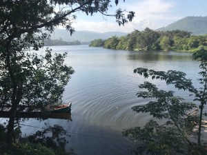 Over huizen gesproken. De overbuurman, dus aan de andere zijde van die mooie rivier, intrigeert ons mateloos. We dopen hem Robinson en verzinnen een heel verhaal bij deze goed gebouwde langharige zonderling die een klein doch zeer eenvoudig paradijsje lijkt te hebben gecreëerd. Mini bamboe huisje op palen aan een strandje en hij is de hele dag bezig met het opknappen van een boot. Verder scharrelt er een hond rond en heeft hij een bord langs zijn property staan met een tekst die niets te gissen overlaat: keep out! De waarheid blijkt minder Robinson Crusoe-achtig te zijn. Navraag leert dat hij de voormalige eigenaar van het guesthouse is en nu met zijn familie naar de overkant is verhuisd. Het mini hutje is dus helemaal niet zijn huis, er staat nog iets groters achter. Onze versie vinden we leuker. Waarom kiest iemand voor zo’n idyllische en verlaten plek? En hoe idyllisch is het hier eigenlijk in het regenseizoen?