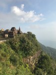 Het hotel is potsierlijk en wanstaltig, maar zo erg dat we er voor fun koffie gaan drinken. Je zal er toch terecht komen middels een georganiseerde tour ofzo. Blij met onze vrijheid toeren we verder, we nemen een ‘verfrissende douche’ in de Popokvil waterval en zien even verderop, eigenlijk al op de terugweg, opeens een mooi bewerkte muur met daarachter een tempelcomplex. Aan de andere kant van de weg een soort half overdekte hal waar de bouwvakkers en hun familie blijkbaar ‘wonen’. Wat een armoede, triestheid en ook contrast. Ook de monniken aan de andere kant van de muur leven erg sober, althans, dat is mijn conclusie als ik zo eens naar binnen gluur bij de hutjes achterop het terrein. Het tempelcomplex zelf is daarentegen prachtig. Later leren we dat het Wat Sampov Pram is. Gebouwd in 1924 door de Cambodjaanse koning Monivong die van de Franse administratie in het koele klimaat een pales mocht bouwen en bij vijf rotsen ook een Pagode bouwde. De rotsen zijn een heilige plaats in de Hindoe mythologie die staan voor de vijf boten waarmee een Khmer prins uit de naga mythologie aan land kwam. Wij vinden vooral de locatie super, met uitzichten over een groene zee van bomen, de kust alsmede de daadwerkelijke zee.