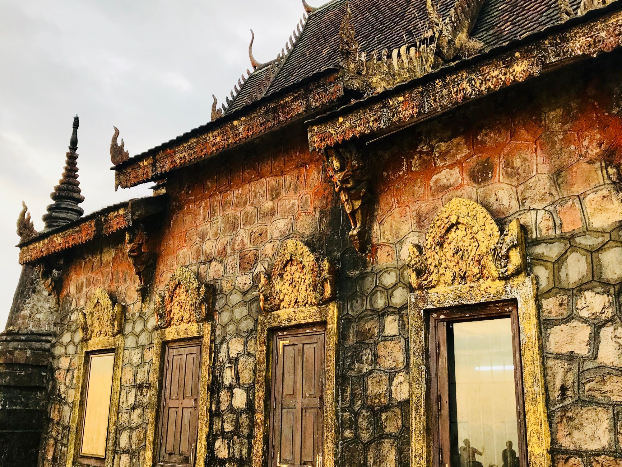 Het is inmiddels einde dag en het licht is zacht. De oranjekleurige schimmel op de oude gebouwen gloeit op en we kunnen de plek maar niet loslaten. Helaas veranderde de prachtige zonsondergang verrassend snel in een donkere lucht en precies wanneer we weer op de brommert stappen komt er ook water uit die donkere wolken. Niet een paar druppels maar een spontane moessonbui. Binnen mum van tijd zijn we drijfnat, met ons de rugzak. De slagregen in combinatie met het snel donker worden is geen feestje. Het doet zeer in het gezicht waardoor stoppen de enige optie lijkt. We begrijpen nu het verschil tussen een pothelm a la willempie en een helm met vizier. We moeten echter minimaal nog wel een uurtje dus zachtjes doorrijden lijkt toch slimmer. Enige voordeel is dat er geen stofwolken zijn van passerende auto’s of trucks maar dat is ook echt het enige wat ik kan verzinnen.