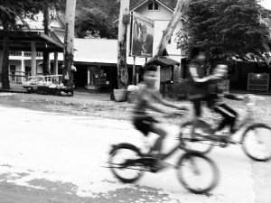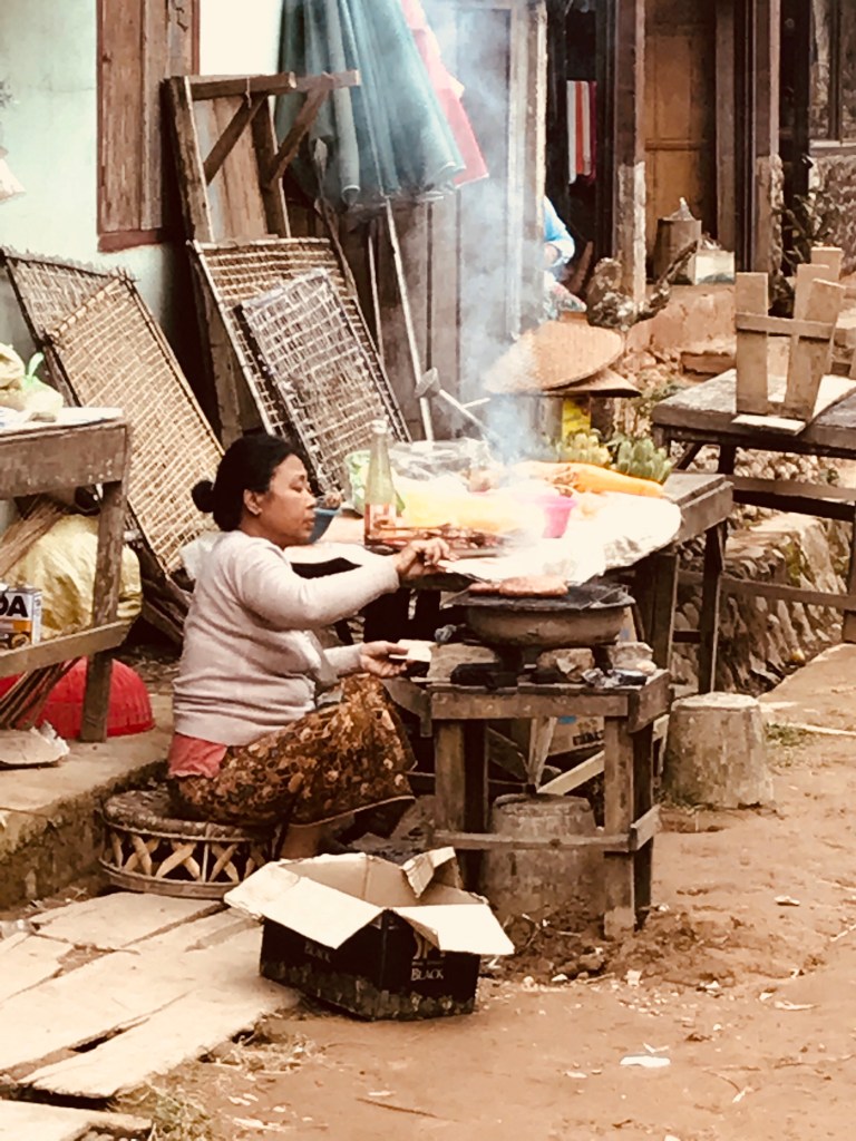 Anderzijds is er het leven slechts 50 meter landinwaarts, daar waar de hoofdstraat loopt en waar je uren kan zitten om het dagelijkse leven te aanschouwen. Mensen zitten voor hun shop of achter de prachtige nog met de voet aangedreven naaimachines, soms nog achter een weefgetouw. Overal staan kleine BBQ’s, er is altijd wel ergens een flinke rookpluim. Dorpelingen van alle leeftijden komen voorbij slenteren, meestal met nog een baby op de arm of rug, de kippen en eenden scharrelen in hetzelfde tempo rond, vergezeld door hond of kat. Kinderen spelen met een fietsband en een stokje, de hanen kukelen de hele dag (en nacht) door terwijl de monniken passeren in hun oranje pijen.