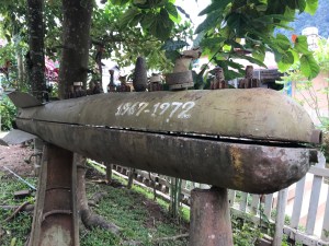 En ja, een niet al te vrolijk einde van Laos, maar wel de realiteit. Terwijl we naar buiten lopen komt er net een Amerikaanse dame aanlopen. Haar chauffeur (?) wijst naar een grote vliegtuigbom met daarin honderden explosieven. We horen nog net haar reactie: “amaaazing”. Ze zal het niet zo bedoeld hebben, maar het voelde toch wat vreemd als je net alle horror gezien hebt.