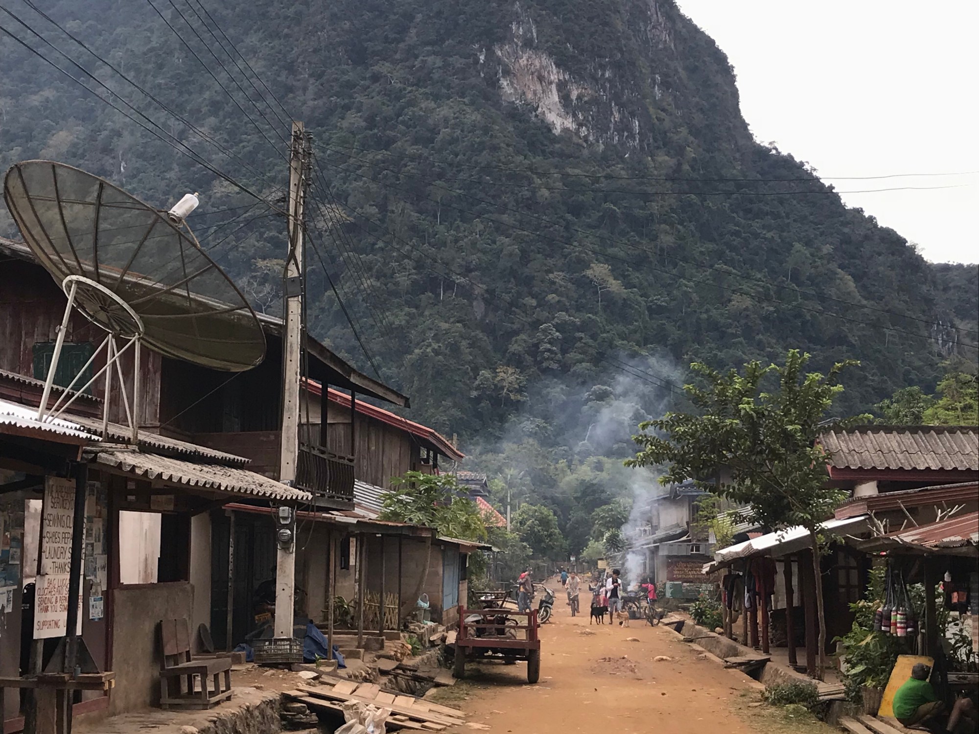 Hier heeft men pas sinds 2013 electriciteit. Het plaatsje is enkel per boot bereikbaar en de, ofwel stoffige ofwel modderige, ‘hoofdstraat’ is kaarsrecht en slechts 500 meter lang. Aan beide uiteinden een hoge berg, verder landinwaarts. Wat ons intrigeerde was dat het ooit een regionaal centrum is geweest. Het is echter compleet plat gebombardeerd door de Amerikanen gedurende de 2e Indochina oorlog. Her en der zie je nog (fragmenten van) bommen liggen en dat voelt dan weer zo raar wanneer je uitkijkt over de vredige bergen, over de rivier, wanneer je naar de mensen kijkt. Wat hebben ze allemaal doorstaan in zo’n kort tijdsbestek? Nu ik dit opschrijf zie ik meteen weer het gezicht voor me van de oude man, zittend onderaan de berg bij het begin met de eindeloze trappen richting viewpoint. Hij lacht zijn 2 tanden bloot, maar we spreken elkaars taal niet. Soms zijn woorden echter niet nodig. Met vingers, waarvan hij er een paar mist, vertellen we elkaars leeftijd. Hij is zeventig. Als ik een neerstortende bom na doe (vliegtuig, boem) knikt hij heftig. Zijn gezicht betrekt, hij zegt ook boem en dan is er stilte. Onuitgesproken woorden. We zien tranen in zijn ogen. Ik voel me schuldig dat ik het onderwerp heb aangekaart, maar hij lijkt gelukkig snel weer in de hedendaagse tijd te komen. Letterlijk, want hij heeft bovenmatige interesse in Joris z’n horloge, of in ieder geval in de tijd die het aangeeft.
