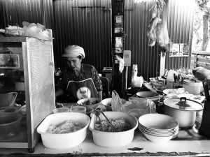 En dan is het zondag en ook nog eens volle maan. Dat is andere koek! De rust lijkt ver weg want er zijn overal kleine, doch zeer luidruchtige feestjes. Het Lao beer en de Lao Lao whisky vloeit rijkelijk en het karaoke geweld neemt met het uur toe. De anders zo rustige en bescheiden Laotiaan transformeert tot een uitbundige, vals zingende popster. Op nieuwjaarsdag was het helemaal een kakofonie van geluid. Ook de restaurant eigenaars vierden feest en besloten enkel eten te fabriceren voor de eigen familie. Gelukkig was de Indiase familie midden in het dorp zo vriendelijk – en zo commercieel – om toch ook voor ons in de keuken te gaan staan. Terwijl we genieten van een heerlijke masala met een lassi (goede voorbereiding voor zuid India) zwaaien we vrolijk naar de dames van middelbare leeftijd die wiegend en dansend op en neer lopen in de kaarsrechte corridor van het dorp, om de schouder een geluidsinstallatie zodat ze in goed in de maat blijven. De eigenaar van ons guesthouse zit ook met z’n familie in de tuin, hij heeft een zondagse trui en schoenen aan, klaar voor diner van gebarbecuede kippenvoeten en bamboe spiesjes met ingewanden. Op het houtvuur staat een grote korf met sticky rice en ongetwijfeld staan er ook wat lokale alcoholische brouwsels binnen handbereik.
