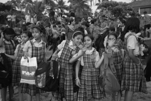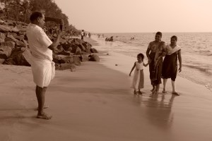 Inmiddels gaan de scholieren zelf voorzichtig, maar uitgelaten, te water. De spijkerbroeken blijven aan, smartphones worden veilig gesteld. De meiden staan verderop wat te giechelen met hun voeten in het water, de sari’s worden toch nat door de golven, maar ze gaan er niet verder in. De meester doet zijn uiterste best de orde te bewaken en ervoor te zorgen dat er niemand verdrinkt. Nu zijn de rollen omgedraaid, wij kijken naar hen en schieten wat foto’s. Zij hebben er beduidend minder last van, zoveel is duidelijk. Ze poseren vol trots, ondanks het corrigerende fluitje van de meester. Ik haal bij een kraampje wat vegetarische hapjes en chapati en we eten dit op een van de rotsen op, uitkijkend over de zee met dienblaadje op schoot terwijl de zon in het water zakt. Het was een andere dag dan verwacht, en dat is nu net het leuke van reizen.