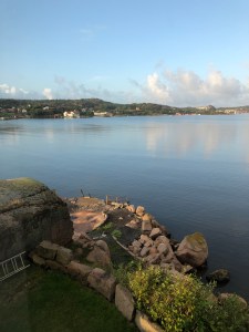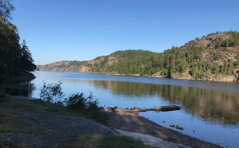 Beter kun je je het echt niet voorstellen! Een ruim houten huis, direct aan het water, gebouwd op de rotsen. Een zonneterras, een trapje om het water in te gaan en een geweldig uitzicht op de baai vanuit elke hoek van het huis. Elk moment van de dag verandert de kleurstelling. Het zachte ochtendlicht, de rode lucht na de zonsondergang met daaropvolgend ‘het blauwe uur’ en ‘s nachts de lichtjes aan de overkant. Niet dat het continue mooi weer was, de wind was er altijd met af en toe ook regen erbij, maar altijd trok de lucht wel weer open en konden we de dag beginnen en eindigen met een duik in de zee. Toen we eenmaal door hadden dat ook de restanten tentakels van de kwallen zorgden voor flinke jeuk (en ja, een warme douche maakt de boel alleen maar erger, typisch geval van Swimmers Itch) wijken we uit naar het nabijgelegen meer. Een soort van brede rivier met heerlijk schoon zoet water, kwalvrij bovendien. Omringd door groene oevers vol bomen, rotsen en heuvels, nergens huizen of een ander teken van leven. Er is zelfs een watervalletje, wat kun je nog meer wensen? Een met de natuur en de ongelofelijke luxe om dan het rijk alleen te hebben. Daar raak je de stress van de dagelijkse realiteit direct kwijt.