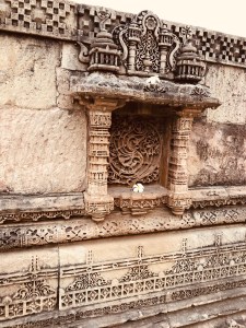 Een prachtig 500 jaar oude en 4 laags diep exemplaar. Overal waar we maar kijken zien we inscripties en bewerkte zuilen. Gebouwd onder het bewind van een van de meest prominente sultans van Gujarat, Mahmud Begada. Een vriendelijke oude man legt in gebrekkig Engels het een en ander uit en wijst ons op mooie beeldjes, allerhande goden en teksten. We weten niet wat we zien en zijn sprakeloos. Oké, bijna dan, want sprakeloos lukt ons eigenlijk zeer zelden.