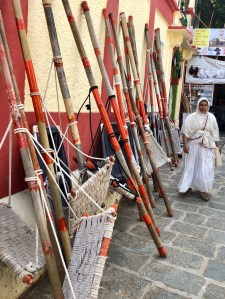 Langzaam de trappen af om de knie te sparen. De mannen met de doli’s, de draagstoelen, zien duidelijk potentieel als ze me naar beneden zien gaan. Daar gaan we echter niet aan beginnen, ik heb de tijd. Gelukkig zijn er wel wat anderen die gebruik maken van de service. Een corpulente heer die al bellend op zijn troon zit. Een oude vrouw in een mooie rode sari, in kleermakerszit met rechte rug. Het kan niet anders dan dat de bamboe draagstokken zorgen voor hele pijnlijke en beurse schouders. Wat een kracht hebben ze. Toch schijnen ze goed te verdienen, in ieder geval vele malen meer dan in de moessonperiode, wanneer ze op het land werken. Waarschijnlijk minimaal zo zwaar werk.
