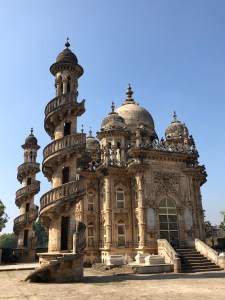 Op loopafstand vinden we de twee mausoleums uit eind 1800. Mahabat Maqbara. Mooi. De rijk bewerkte minaretten met hun hele smalle spiraalvormige trappen zorgen er wel voor dat mijn heupen extra breed lijken en m’n schoenmaat extra groot. Kortom, ik voel me een soort reuzin die probeert elegant naar boven en beneden te komen, liefst ook nog zonder mijn hoogtevrees te laten blijken. Deze poging mislukt uiteraard volledig, echter, de minaretten zijn er gelukkig niet minder fraai door. Het uitzicht evenmin. Beide mausoleums zijn afgesloten voor publiek dus het blijft beperkt tot het spieken door de vensters en tralies. De buitenzijde toont echter verschillende invloeden en is dusdanig bewerkt dat ik de hete middagzon amper doorheb terwijl ik de boel bewonder.