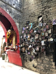 Bij de poorten zijn diverse mini tempeltjes en heiligdommen dus niemand loopt er zomaar aan voorbij. Ook veel foto’s van kinderen aan de wanden. Het ruikt er heerlijk naar wierook en brandende kaarsjes. De prasada offers kunnen van alles zijn maar meestal zien we bananen, bloemen, wierook, gekleurd poeder en geld. we kijken en maken wat foto’s. In plaats van irritatie door mogelijke verstoring van zo’n ritueel nodigt de man ons uit om ook te offeren. Hij geeft ons de spullen en legt uit wat te doen. Dat is dus India.
