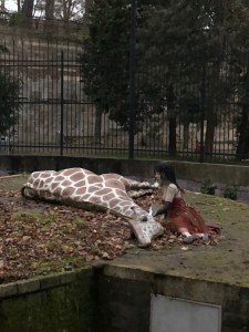 Achteraf lees ik over de ‘Halfautomatische Troostmachine’ en de ‘berenkuil controverse’. De impasse werd blijkbaar doorbroken door toch een bronzen beer op een bankje verderop aan het ontwerp toe te voegen. Eenzaam en treurend zit de beer daar terwijl het strelende meisje bij de dode giraffe elk jaar een nieuwe jurk krijgt aangemeten door studenten van de modeafdeling van de Academie Beeldende Kunsten. Volgend jaar maar eens kijken was de dresscode is geworden.