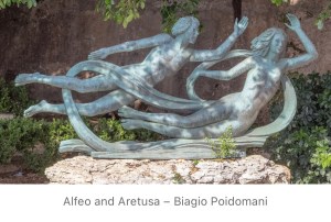 Inmiddels is het overigens brak water en ook blijken er nog vele andere versies te bestaan. Zoals een ontklede Aretusa die een bad wilde nemen. Het water bleek echter de God Alfeo te zijn die natuurlijk direct veranderde in een aantrekkelijke man, klaar om haar te veroveren. Vervolgens ontstond een soort #metoo situatie en Artemis helpt de gestalkte Aretusa door haar in een bron te veranderen. Echter, de wanhopige Alfeo vraagt zijn vader Oceanus te helpen, die vervolgens per direct het water van de Ionische Zee opent zodat zoonlief linea recta naar Sicilië kan stromen. Preciezer gezegd, naar de bron zodat hij zijn geliefde nimf kan weerzien. Hoe dat verder afloopt vertelt het verhaal niet, maar mijn meestal nogal praktische gedachten vinden die legendes dus wel prettig. En de deels door papyrus en ander groen overwoekerde bron krijgt hiermee een historie. Dezelfde Aretusa en Alfeo zie je ook weer terug in de eerder genoemde Fontana di Diana, tezamen met de nodige zeemonsters.