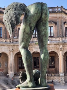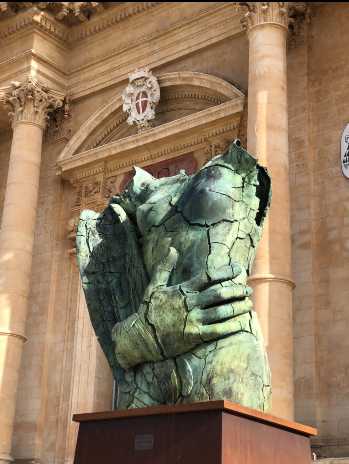En zo zitten we ‘s avonds heerlijk te eten op de trappen achter de kathedraal, nemen we – net als iedereen – een granita bij café Sicilia (de eigenaar is tenslotte ooit verkozen tot beste patissier van Italië en dan zit je terras altijd vol) en slenteren we door de verschillende niveaus van de stad. Pleinen met indrukwekkende kerken en hoge trappen. Her en der uitzichten over de vallei en het lager gelegen deel. Het hoogstgelegen deel van de stad staat vol pallazi en was dus voor de adel, het middelste gedeelte was voor de geestelijken en dus de nodige kerken, inclusief de Cattedrale di San Nicolò. Een gezamenlijk ontwerp van de drie lokale architecten. 75 jaar over gedaan om te bouwen en 2 eeuwen later, in 1997, stortte het grootste deel in. Nu overigens weer open voor het publiek. En de trappen voor de kathedraal staan vol. Tijdelijk. Er zijn namelijk zes mega sculpturen van Igor Mitoraj geïnstalleerd. Prachtig. Afwijkend van de rest en daarmee zo mooi. Ze blijven nog tot eind oktober staan, verlengd door de pandemie, dus wie in de buurt is…