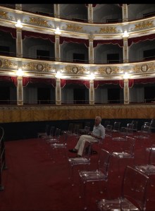 De 18e. Heerlijk loom wakker worden. We brunchen met gegrilde paprika, vers van de bbq bij de groenteboer om de hoek. Kom daar maar eens om in Rotterdam. We besluiten het barok te laten voor wat het is en gaan voor een middag duik in de zee. Pendelbusje functioneert prima. Hetgeen belangrijk is want het Codex festival is gaande in Noto en we hebben nog kaarten kunnen krijgen voor een avond voorstelling. Dans op muziek van Bach, Goldberg. Mooi excuus voor de rode jurk. Het duurste kledingstuk wat ik ooit gekocht heb. Was bedoeld voor m’n feest maar past eigenlijk veel beter in Italië. De gordijntjes van het theater zijn haast dezelfde kleur.