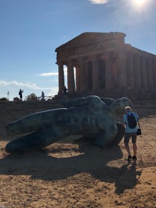 Al deze tempels, de graven in de muren, allemaal ruim 2500 jaar geleden gebouwd. Hoe kreeg men dat toch voor elkaar? Ik hoor een gids zeggen dat Concordiatempel de best bewaarde Griekse tempel is na het Pantheon in Athene. Het enorme bronzen beeld van de ongehoorzame en neergestorte Icarus biedt een mooi contrast met de tempel. We (her)kennen inmiddels het werk van deze Poolse beeldhouwer, Igor Mitoraj. Zie ook de blog over Noto. Ik vind het mooi. Klassiek, mythologisch maar ook theatraal, met uitsparingen in het lichaam waarin dan weer kleine figuren worden weergegeven, soort in-perfectionisme. Hij heeft het tien jaar geleden geschonken en Icarus ligt er dus 2490 jaar later dan de rest.