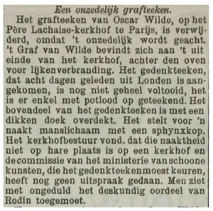 Het graf van Oscar Wilde heeft inmiddels een glazen omheining rond het grafmonument. De graffiti trend tezamen met de lipstick kusjes trend was teveel geworden. Alle lipstick en graffiti is er nu afgehaald. Niet dat het echt helpt, want nu wordt, zo te zien, nog steeds af en toe het glas gekust. Persoonlijk vind ik het een nogal lelijk massief monument. Juist daarom, en omdat het zo uit de toon valt, ben ik terwijl ik dit schrijf nog eens wat gaan googlen. Blijkt dat Jacob Epstein het beeld heeft gemaakt, zo’n tien jaar na de dood van de schrijver, dus inmiddels is het ruim een eeuw oud. Tijdens mijn zoektocht stuit ik op een grappig bericht, geplaatst op 2 oktober 1912 in de Vooruit, een socialistisch dagblad van onze Gentse zuiderburen.