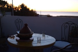 Inmiddels is Fatima op dreef. We krijgen een home made tagine van moeders op ons eigen terras geserveerd. De zonsondergang laat zich van z’n beste kant zien en we hebben nog wat wijn over uit de darkstore. Pure luxe! Waarom wilden we ook alweer naar Rabat?