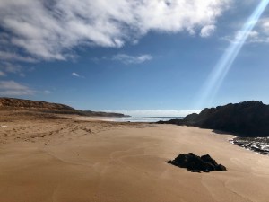 Vlakbij ligt ook een marabout begraven. We zien het in de verte vanaf ons terras en besluiten de tombe met een bezoekje te vereren. Geen idee wat we precies mogen aantreffen, maar een groep voetballende heren op de heilige grond is niet wat we bedacht hadden. Toch is het zo. Stoere vissers. De wandeling ernaartoe is via de duinen tussen de lagune en zee, daar waar de geiten lopen. De kustlijn is vol met mooie rotspartijen en mini baaitjes.