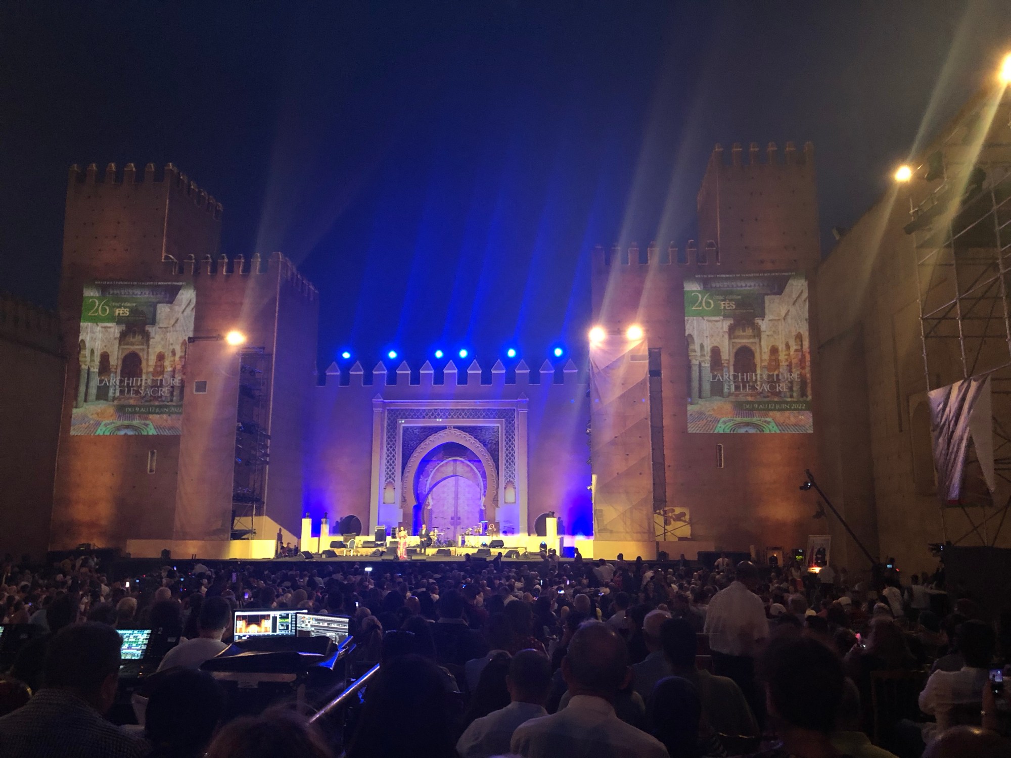 Na een COVID stop van 2 jaar is nu het jaarlijkse muziekfestival gaande; Festival de Fès des Musiques Sacrées du Monde 2022. Mond vol en klinkt goed. We hebben nog kaarten kunnen krijgen voor Ibrahim Maalouf. De veelzijdige jazz trompettist met z’n Arabische twist en improvisaties is de hoofdact. Maalouf, iets met een extra ventiel waar ik verder echt geen verstand van hem, maar voor ons bekend middels spotify. Vorig jaar gemist in de Doelen en dan nu dus hier. Op een venue waar je U tegen zegt. Alleen al de EHBO post is fantastisch, een tent direct uit een duizend en één nacht sprookje, compleet met tapijten, kleurige kleden en sfeerverlichting.