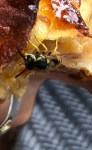 Enige risico zijn de wespen, ze zijn er zodra je gaat zitten. Lijkt alsof ze ons willen boeten voor het feit dat we uiteindelijk toch gezwicht zijn voor het Franse appeltaartje. Stoïcijns blijven ze zitten op het zoet. Nu hun larven volgroeid zijn, moeten ze ergens anders hun zoetigheid halen. Dat snap ik, maar liever niet precies op ons ontbijtje.