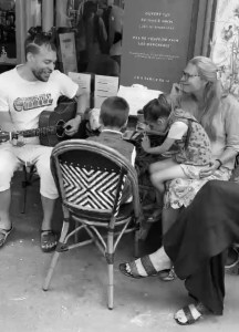 Gelukkig worden we afgeleid door Abello, Nienja en hun kinderen. Voor we het weten luisteren we naar vrolijke verhalen en even zo vrolijk gitaarspel, Peruviaans Nederlandse mix bij een Franse boulangerie. Daar waar vrijwel continue een rij staat van wijkbewoners die hier hun stokbrood en croissants komen halen.