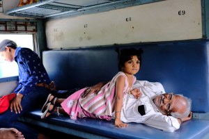 Unreserved seats betekent wel dat je er vroeg bij moet zijn. Dat zijn we en dus zijn stoel 51 en 60 voor ons. Tegenover elkaar bij het raam, althans, mits er een raam zou zitten. Bij het gat met tralies is een betere benaming. Naast ons banken voor 4 personen. Al is dat aantal redelijk subjectief, zoals altijd hier. De trein vult zich vlot en als er te weinig plek blijkt te zijn wordt men inventief en nemen de passagiers de bagagerekken als zitplek. Hetgeen overigens al snel na vertrek gebeurt. Het is weer een kleurrijke belevenis met de nodige fotoshoots en interviews. Het patroon is ook weer duidelijk. Ik zit rustig wat te kijken of te lezen en Joris laat in alle vertrouwen alles bij mij achter en vertrekt met een van zijn geliefde camera’s richting coupés en perrons. Zelfs zijn telefoon gaat niet mee dus als hij ooit door vervoering of een conversatie de trein mist wordt het nog interessant.