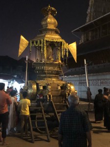 Uiteindelijk eindigt de processie daar waar het begon, recht voor de tempel en wordt Krishna weer met de nodige bombarie naar binnen gedragen. De rust keert terug en het plein stroomt leeg. En dat allemaal op een doordeweekse woensdagavond. Er zijn avonden die minder enerverend verlopen. En dan weten wij er nog niets van. Voor de toegestroomde pelgrims zal het vast en zeker nog vele malen meer betekenis hebben.