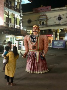 Want elke tempel heeft blijkbaar zijn eigen unieke manier om de chariot (tempelwagen), welke dus wel toegestaan is in Car street, te versieren en de diverse rituelen uit te voeren. Hier in Udupi maken de priesters na een puja-ceremonie in de tempel een boottochtje over het heilige water in het midden van het complex. Daarna wordt het Krishna-beeld uit de tempel en in de wagen gedragen. Vervolgens wordt deze wagen door tientallen toegewijden door Car street getrokken en geduwd. Voorop loopt een klein orkest dat toch heel wat geluid produceert. Halverwege wordt er gestopt en is er vuurwerk. Ook verbranden ze in olie gedrenkte kledingstukken waarna lenige jongens salto’s en radslagen fabriceren tussen een spoor van kleine brandende tempellichtjes. Twee enorm grote ‘poppen’ worden eveneens verzet, geen idee wat daar de gedachte bij is, het lijken me een soort wachters. Wie het weet mag het zeggen.