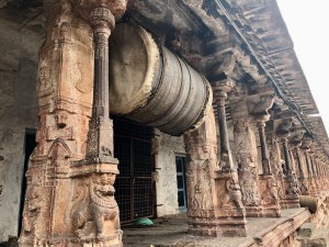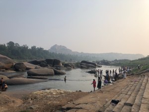 Er wordt gebaad en geofferd, soms gecombineerd met de meer huishoudelijke taken zoals de was. Dat vind ik ook elke keer weer zo bijzonder aan India, alles loopt door elkaar heen. Vier biddende en badende jongens uit Hyderabad en nog geen vijf minuten later krijg ik een Linkedin verzoek en word ik uitgenodigd op hun Microsoft kantoor. Dat soort dingen kan ik echt vooraf niet verzinnen. Met m’n nog slaperige hoofd ga ik in op de vele selfie verzoeken, ook met de Microsoft boys, tegelijkertijd wil ik vooral niet weten hoe dat er allemaal uitziet op Insta. So be it. Ze worden er blij van en we zijn tenslotte in happy Hampi dus zo hoort het te zijn. Ook in de vroege ochtend bij de ghats. ‘s Middags komen we een Italiaanse tegen bij een van de tempels. Ze reist alleen en heeft uiteraard dezelfde ervaring. Oak zij is verbaasd dat ze nergens anders westerse toeristen tegenkomt. Zelfs niet bij deze Unesco tempels. Zal mogelijk toch nog het effect zijn van de COVID. Het is raar, want ondanks dat het een enorme impact heeft gehad, zeker hier in India – en mogelijk dus nog steeds – wat is twee jaar wanneer we tussen deze eeuwenoude ruïnes lopen? Dan is het opeens een fractie van een seconde. De Koninklijke stallen waar de olifanten stonden, het mooie Queens Bath, de muzikale pilaren van de Vijaya Vittala-tempel (de aanwezigheid van metaalerts en silica in het steen zorgt ervoor dat je do-re-mi kunt tappen met enkel je duim)… Ik droom altijd een beetje weg en probeer me in te denken hoe het er toen aan toe ging. Vijf eeuwen terug was ditzelfde Hampi namelijk een metropool met maar liefst 500.000 inwoners. Dat is dus immens voor die tijd.