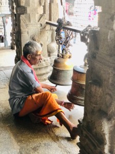 In de centrale hal Ranga Mantapa zijn prachtige plafond schilderingen. Meer dan 500 jaar oud en één van de weinige overblijfselen van deze vorm van de Vijayanagara kunst. Rengit had al verteld dat hij daar, in de Ranga Mantapa, met de moeder van Asha is getrouwd. Wat een locatie! En wat fijn dat er ook liefdes huwelijken worden gesloten. Blijkbaar is er hier vorige maand ook een ander internationaal huwelijk gesloten. Een Belgische toerist met een lokale gids / riksja chauffeur. Het was groot nieuws en stond in de diverse kranten. De twee ceremonies die wij zien worden hopelijk ooit ook een liefdes huwelijk. Nu zie ik het nog niet zo. Ze kijken elkaar niet aan, tonen ook niet extreem gelukkig. Eigenlijk meer een beetje angstig. De pandit – een Hindoestaanse priester – verzorgt met veel precisie allerhande rituelen. Er staan schalen oranje bloemen en offers van bananen, yoghurt en ananassen. We horen Sanskrietgebeden en ruiken sandelhout. Temidden van dat alles zit op de grond een zwaar opgemaakte en nog erg jonge bruid, haar lichaam bedolven onder tradities, verwachtingen, een rood-met-gouden sari en kilo’s armbanden, oorringen, hoofdtooien en ringen aan vingers en tenen. Alle vrouwen lijken beschilderde handen en voeten te hebben. De hindoe swastika’s voeren hierbij de boventoon. Het blijft vreemd om in zoveel feestvreugde een symbool te zien wat ik associeer met haat. Hier betekent het geluk en welzijn.