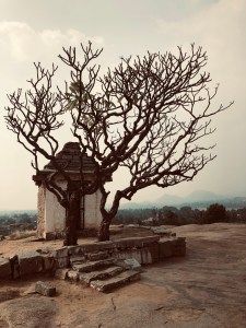 Nadat het bruidspaar met veel bombarie en kakofonisch getrompetter is vertrokken en wij de rijst uit onze voetzolen gepeuterd hebben, klauteren we de rotsen op direct achter de tempel. Het is er verrassend stil. Geen grote groepen schoolkinderen, geen selfie verzoeken. Enkel oude tempeltjes en vergezichten. In een hoekje zit een sadhu, bezig met het behalen van de moksha (spirituele bevrijding) middels meditatie. Althans, dat is mijn aanname. Wie weet zit hij gewoon uit te rusten voordat hij straks weer naar beneden klautert. Een van de vele mysteries van incredible India. Voor ons in ieder geval geen spirituele bevrijding, wel een fijn geluksmomentje. De zon wordt minder fel, er is een lekker windje en we hebben een prachtig uitzicht. Happy couple in happy Hampi. En het is nog wel onze feestdag. Daar hadden we nu een selfie van moeten nemen.