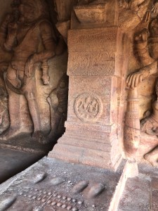 De tweede grot is opgedragen aan Vishnu. Dwergen, yali’s en grote wachters bewaken het geheel. Mooi. De derde, tevens de grootste tempel, gaat over alle incarnaties van Vishnu. Deze is van boven tot onder bedekt met gravures en inscripties. De laatste in rij is een Jain tempel. Dit lijkt me een bewijs van religieuze tolerantie van de creatieve Chalukyas architecten.