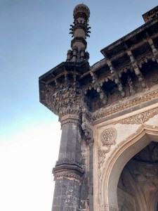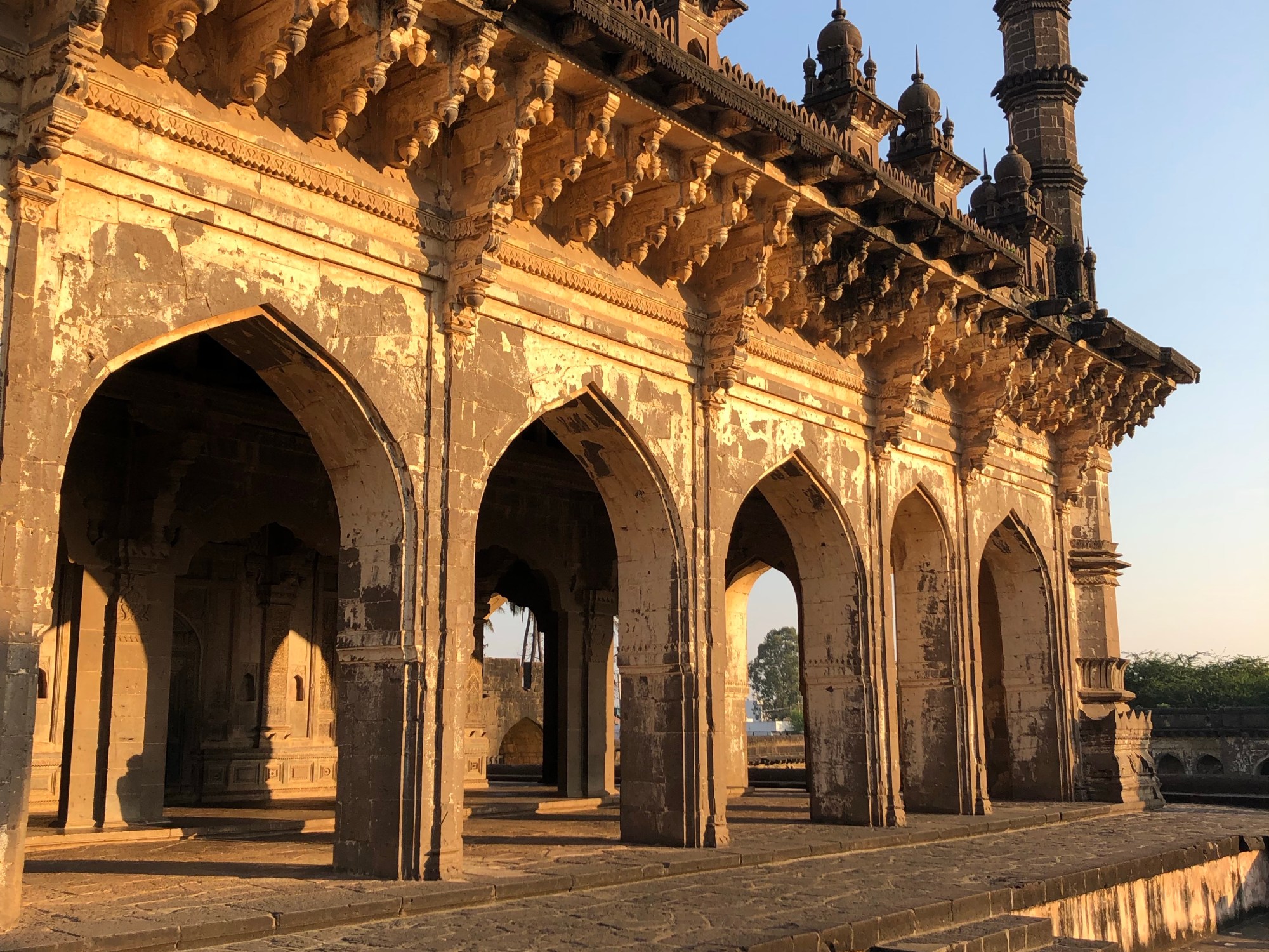 Het absolute hoogtepunt van deze stad is voor ons toch wel het prachtige Ibrahim Rouza. Wat een monument. Zeker in het zachtere licht aan het einde van de dag. We blijven er tot sluitingstijd. Keizer Ibrahim Adil Shah II (wie kent ‘m niet) liet het geheel bouwen voor zijn vrouw. Hij overleed alleen eerder dan verwacht en zo nam hij het dus als eerste in gebruik.