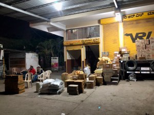 Na deze tours door het islamitische Bijapur vertrekken we om 23.55 uur met de nachtbus. Eindbestemming Hyderabad. Ruim voor tijd laten we ons afzetten bij het pick up point. We dachten daar nog wel een koffie of chai te kunnen scoren, het blijkt echter niet meer te zijn dan een parcel hub in een buitenwijk. Blijkbaar worden er naast de pakjes ook af en toe mensen opgehaald. Gelukkig zitten er al twee mensen anders zou ik echt twijfelen of we wel op de juiste plek zijn afgezet. Er lopen slechts wat koeien voorbij. De reeds wachtende meneer vertelt ons dat de bus een uur vertraging heeft. Dat valt tegen. We zoeken twee niet gescheurde plastic stoeltjes uit – nog niet eenvoudig – en gaan dus maar wachten.