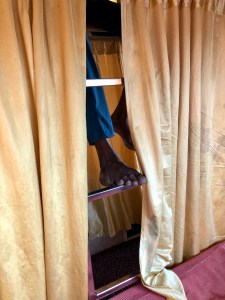 Het uur vertraging blijkt nog iets te positief te zijn maar uiteindelijk arriveert er een verre van luxe AC sleeper bus. We hebben weinig keus en dus liggen we even na tweeën op een dun en viezig 2 persoon matrasje. Privacy is gewaarborgd middels goudgele gordijntjes waar eveneens de nodige vlekken in zitten, gelijk aan het matras. De bruine fleece deken wil ik al helemaal niet aanraken en ik ben echt heel erg blij met ons idee om de aangeschafte stranddoek bij de hand te houden. Dit kan mooi als laken dienen. Het goede nieuws is dat er echt niemand naar onze kaartjes vraagt, dus geen verwarring over namen, sexe of leeftijd. Dat wil je ook helemaal niet hebben midden in de nacht. Wel is er verwarring over het toilet. Joris had nog even gekeken voordat we onze ogen gingen sluiten. Jawel, achterin de bus. Groot is mijn teleurstelling dan ook wanneer ik rond vier uur met een bomvolle blaas in het donker uit ons tentje kruip. Geen idee waar hij die toilet gezien had, maar er is enkel een verlicht bordje met nooduitgang.