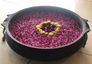 Als ik die middag netjes opgedirkt vertrek voor een lunch met collega’s helpt ze me, ongevraagd, met m’n nieuwe sjaal. Die moet duidelijk anders gedrapeerd worden. Mijn namaste zorgt voor een grote glimlach. We komen er wel. Maar wanneer ik vervolgens ‘s avonds ook nog even weg ga kijkt ze me nogal afkeurend aan. Misschien omdat het al donker is? Voelt alsof ik, als vrouw alleen, vreselijk onzedig bezig ben door ‘uit te gaan’ nu Joris er niet bij is. Ik hou het op goed bedoelde zorgzaamheid. Bij terugkomst – let wel, nog voor half tien – staat ze direct bij het grote hek om open te doen. Zodra ik binnen ben gaat het slot erop. Het is me duidelijk. Binnen blijven anders is ze er niet gerust op. Wanneer ik de volgende ochtend om 5.45 uur dan toch echt vertrek staat ze er weer, net als Gurpal. Hij dit keer in een ander slaap tenue. Hij was uit gegaan en heeft slechts drie uur slaap achter de rug. Dan ben je toch wel een super host zou ik denken. Hij zal hopelijk nog even terug naar bed gaan terwijl ik in de Uber stap. Het hek wordt weer afgesloten, later vandaag zullen er vast en zeker weer verse bloemen worden neergelegd.