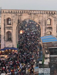 Wel bezoeken we hier nog twee art galleries en eindigen we nog precies voor zonsondergang bovenop de Charminar. Meer geluk dan wijsheid trouwens. Ik was sowieso zo moe dat ik in die eerder genoemde riksja in slaap viel terwijl de chauffeur dus van die halsbrekende toeren uithaalde. Joris had echter zijn zinnen gezet op een antiekmarkt en alle markten bleken rondom de Charminar te zijn: de ‘vier minaretten toren’.