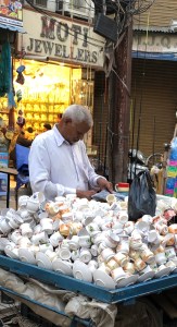 Eenmaal weer beneden en dieper in de smalle straatjes komen we bij de Chiddi Bazar – exotische en minder exotische vogels in piepkleine hokjes. Daarnaast kippen, konijntjes en al wat niet meer. Ik wil ze allemaal bevrijden. Het loopt automatisch over in de vleesmarkt, hele hompen vlees hangen aan grote haken en zijn bedolven onder de vliegen. Hier willen we duidelijk niet zijn, zeker niet in het halfdonker.