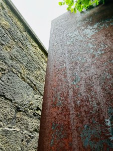 Vol indrukken en vraagtekens lopen we uiteindelijk weer naar buiten. Want ook daar veel te zien. Bijna verstopt vinden we groot staal van Richard Senna. Het ruwe spreekt me aan, net als in Bilbao. Aan de andere zijde van het park vinden we nog een mooie tentoonstelling over de cinema van Portugal en in het bijzonder over het werk van Manoel de Oliveira. Multi media in een voormalige schuur. Grote schermen, mooi opgesteld, creatieve weergave met tussendoor prachtige oude beelden. Dus mocht je er zelf in de buurt zijn, niet overslaan.