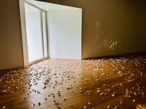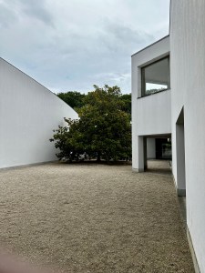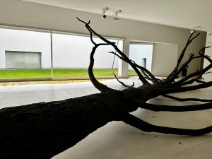 Een werkelijk prachtig museum, omringd door een enorm park, een villa, een theehuis, garages en schuren met daarin ook nog de nodige kunst. Eigenlijk hadden we aan een dag maar net genoeg. Het museum zelf is een parel van de hand van Álvaro Siza Vieira. Minimalistisch, strak en wit. Vele malen indrukwekkender dan zijn hoge kolos New Orleans die thuis op de Kop van Zuid staat. Binnen in dit mooie gebouw zijn er momenteel twee grote tentoonstellingen. De gehele linkerzijde is in beslag genomen door Allora & Calzadilla, een samenwerkend duo, komend uit Amerika en Cuba, wonend in Puerto Rico. De tentoonstelling Entelechy brengt blijkbaar een aantal van hun bekende werken samen. Ik schrijf bewust ‘blijkbaar’ want we hadden er beiden nog nooit van gehoord. Het is een combinatie van bloemen, performance, geluid, video, fotografie en stilte.