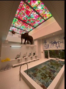 We eindigen onze art tour met een warm bad in het creatieve badhuis. Een mooi einde en op loopafstand van ons guesthouse. Heerlijk stomen terwijl een enorme olifant de grens bewaakt tussen de dames en heren. Met mij stappen twee hoogbejaarde dames in het hete bad. Mooi om te zien dat de lokale bevolking het badhuis ook nog steeds gebruikt. Ook hier geen echte bezinning want de bodem van het bad is vol geplakt met prachtige oude erotische lenteplaatjes, afgewisseld met jaren 50 modellen en allerhande filmdiva’s. Teveel om te bekijken. Wel zorgen de twee dames ervoor dat de breekbaarheid van de ouderdom bij me binnenkomst. Ze zijn zo tenger. Wat zullen ze al niet meegemaakt hebben? En wat vinden ze ervan dat het eiland af en toe bevolkt wordt door toeristen? Dat er miljoenen wordt gepompt in allerhande elitaire kunst? Ik zal het nooit weten want ze spreken geen woord Engels. Ik glimlach dus maar een beetje naar ze en ik sluit m’n ogen terwijl ik luister naar hun conversatie. Het zijn zachte prettig aandoende klanken waarvan ik echt helemaal niets begrijp. En dat is ook helemaal ok.