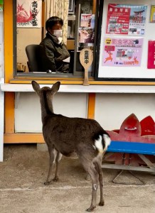 Ik weet niet wat me langer gaat bijblijven. De oesters of de maaltijd in onze herberg. Misschien moet ik foodtrips gaan organiseren. Dan begin ik in Japan… In ieder geval zijn we blij dat we voor een overnachting hebben gekozen. Einde dag stappen de meeste mensen namelijk weer op de boot terug en keert de rust over het eiland. De heilige herten (ja, ook hier de sika herten, net als in Nara) leggen zich te rusten zodat ze de volgende dag weer volop kunnen meedoen bij de nieuwe stroom toeristen. Ze zullen inmiddels vast en zeker een aangepast dieet hebben.