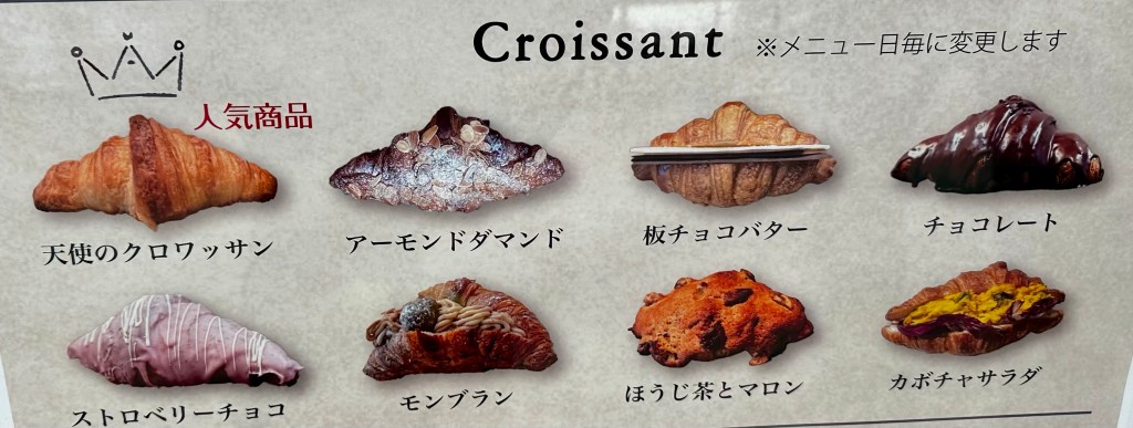 Deze reis zijn wij nogal vasthoudend (net iets anders dan gaman), onder andere in onze zoektocht naar lekkere koffie. Veelal met succes, iets waar we dan extra vrolijk van worden. En wij niet alleen. Vanmorgen bij vertrek hadden we nog wat tijd over. Laten we nu net een etalage passeren met allerhande croissants. Belangrijk detail wat niet onvermeld kan blijven (@wendy, let op!), het lijkt erop dat de crompouce via social media is gearriveerd in Nagasaki.