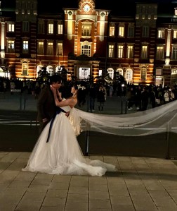 Wat ook de oorsprong moge zijn, de restauratie van dit deel van het station werd elf jaar geleden afgerond. Het heeft dus best even geduurd voordat de schade door de Amerikaanse bombardementen hersteld was. Vandaag de dag is het blijkbaar ook een populaire fotolocatie. We passeren een bruidspaar. Zij in een witte strapless jurk, welke elke 20 seconden omhoog gehesen wordt terwijl ze tegelijkertijd haar kersverse echtgenoot zeer duidelijke aanwijzigingen geeft omtrent houding en poses. Een vriendin of familielid laat – net buiten beeld – de sluier met een sierlijke zwaai keer op keer door de lucht zweven. Ze moeten het toch steenkoud hebben, de ideale foto heeft echter prioriteit. Omdat er continue mensen passeren (niet vreemd gezien de functie van het gebouw) staat er een soort verkeersleider bij – met neon verlichte stok – om de passanten in goede banen te leiden. Men heeft echter niet op die Nederlander gerekend, de man met de Fuji camera. Hij die zonder het door te hebben de ultieme foto van de fotograaf verpestte door precies op dat moment in zijn beeld te gaan staan. Denk dat de foto straks in ons eigen Japanse lakplakboek zit, inclusief een ‘door de wind’ zwevende sluier. Hier alvast de iPhone versie.