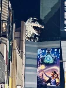 Wanneer we langs de Toho bioscoop lopen – daar waar Godzilla dreigend bovenuit steekt, rook spuugt en met zijn klauwen het gebouw doorboord – zien we dat Wim Wenders Perfect Days* te zien is. Hoe gaaf is het om deze parel juist in Tokio te zien? Helaas betekent dat nog bijna vier uur wachten en dus besluiten we dit te bewaren voor na thuiskomst.