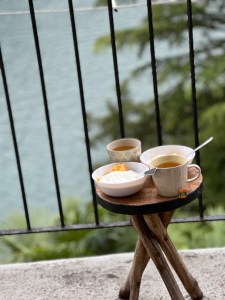 Deze week in Nesso is voor mij een werkweek. Geen straf in deze omgeving. De wifi werkt perfect, de eettafel is een prima bureau en zodra de zon onverwachts toch doorkomt zit ik in de tuin. Ze hebben een enorme lap grond met verschillende etages. Het is een luxe want naast het balkonnetje hebben we dus een eigen terras tuin. Ook hier weer altijd het Como meer als constante factor en uitzichtpunt. Het geheel ligt in een beschermde zone en vanwege de beschutte ligging heerst er een soort micro-klimaat. We vinden er fruitbomen, wijnranken, bloemen, kruiden en ook nog stukken ‘oerwoudgroen’.